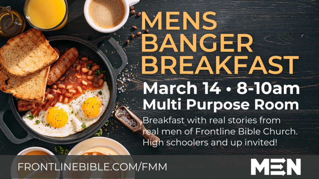 Join us for our Men’s Banger Breakfast! We will be meeting in the FBC Multi Purpose Room for a hearty breakfast and real stories from real men of Frontline Bible Church. High Schoolers age and up are welcome! Bring a friend with too! Please sign up so we have enough food to go around.