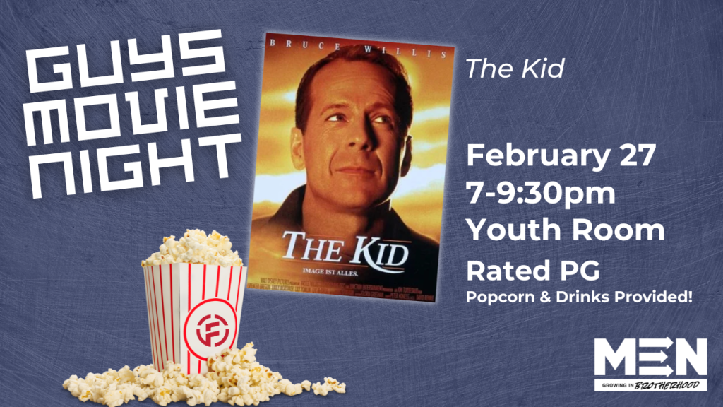 Guys, grab a friend and join us for GUYS MOVIE NIGHT, Friday, February 27 at 7pm.