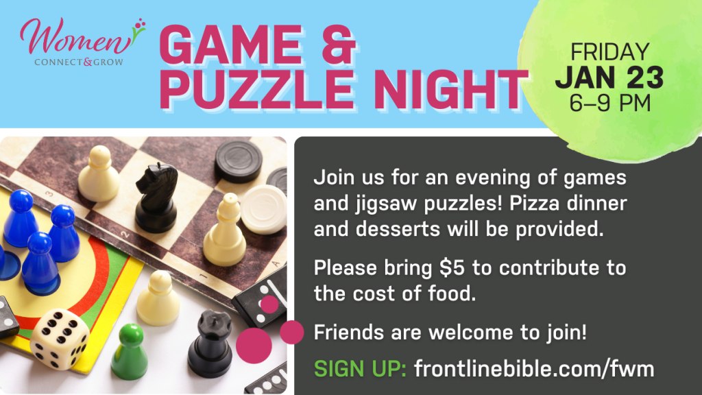 Join us for an evening of games and jigsaw puzzles! Pizza dinner and desserts will be provided; please bring $5 to contribute to the cost of food. Friends are welcome to join!