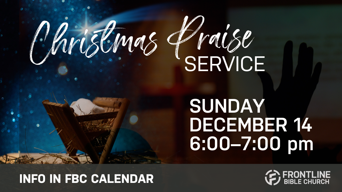 The Christmas Season is beginning again! One of Frontline Bible Church’s favorite traditions is the Christmas Praise Service. This event will be a night of songs and worship celebrating the birth of Christ led by FBC’s Director of Worship, Leo Caldas. This event is open to everyone, so please bring your friends and family with you! Nursery will be available. Following the service will be a time of fellowship and refreshments.